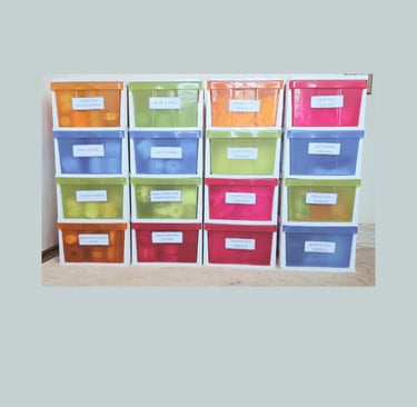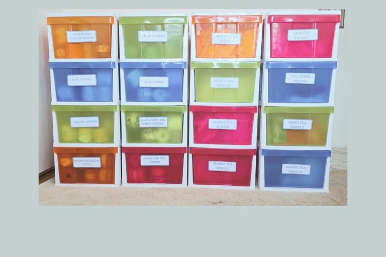 Next, we introduced vibrant, labelled storage containers to group and store Gina’s supplies. By assigning a specific purpose to each box—like “Cotton by Colour” or “Tea Towels”—Gina can now easily find what she needs without wasting time.